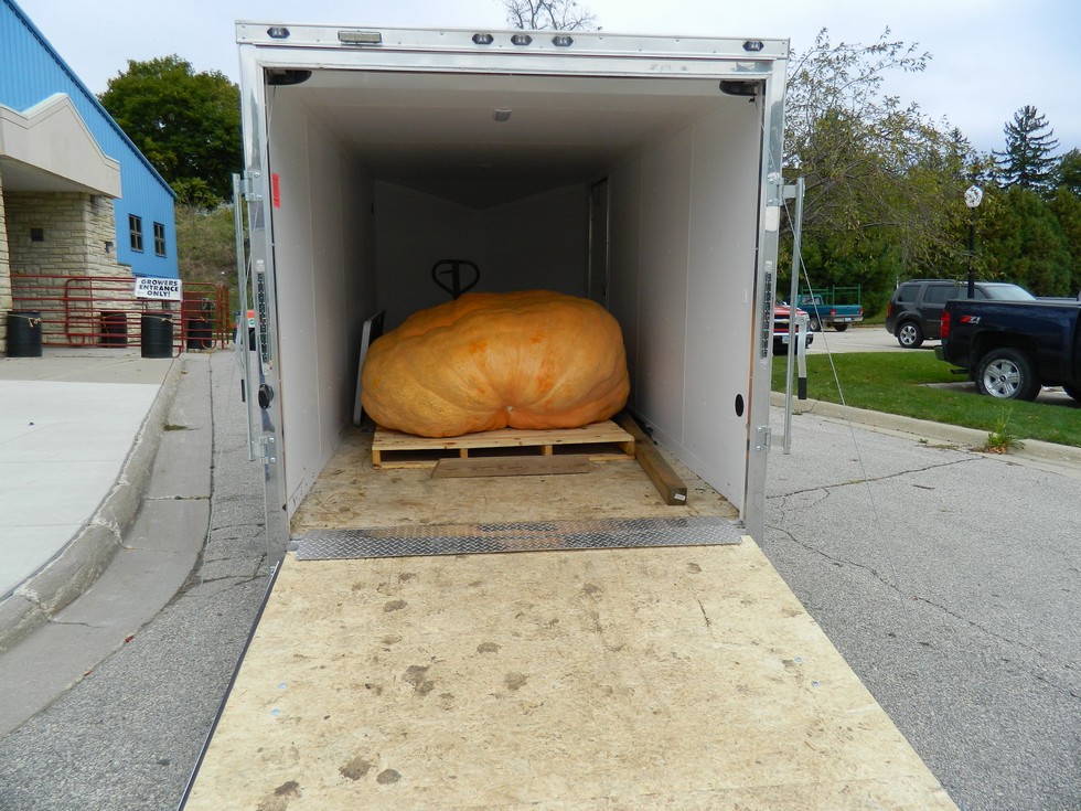 Scott Steil's 1666.5 pumpkin on the trailer before weighing. He beat Don Young's site record by 4.5#, but Don's state record was not broken.
