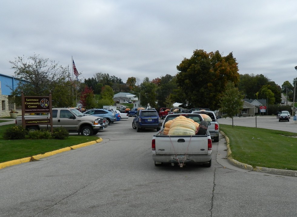 Trucks lined up waiting to get to the scale. With so many huge pumpkins it takes a long time to get them moved and weighed safely.