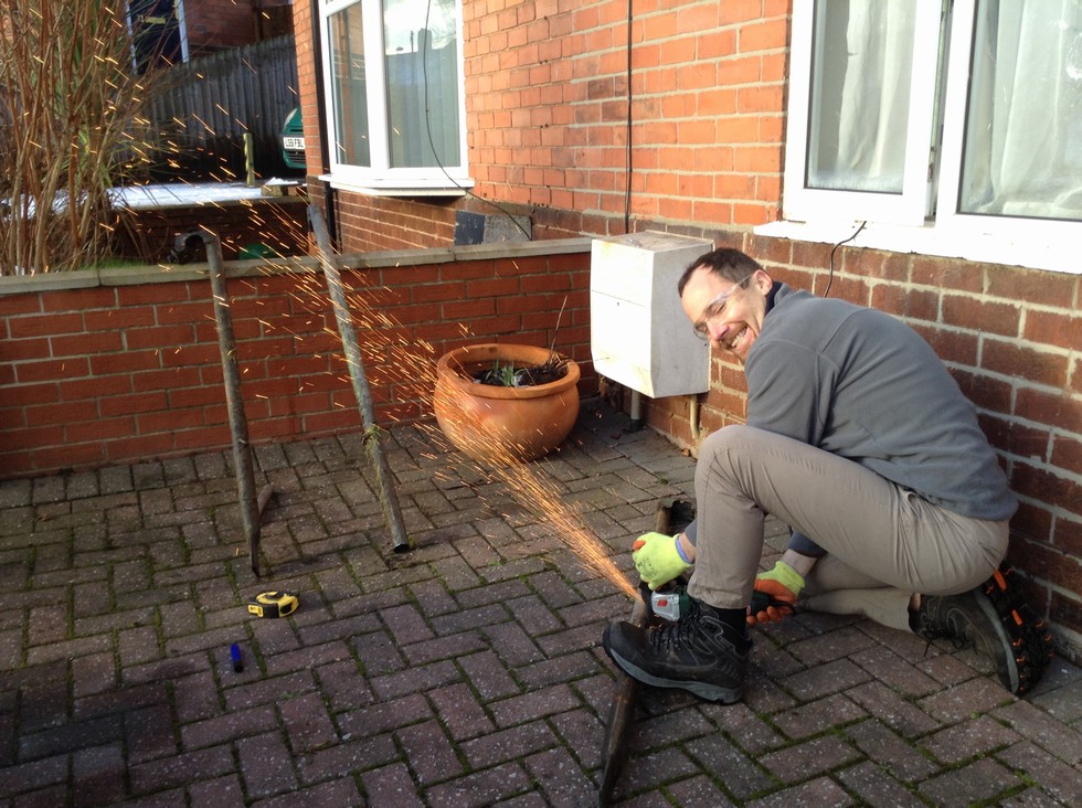 Step 1: salvage enough scaffold tubing to make 10 ground tubes, measure and cut using new christmas present