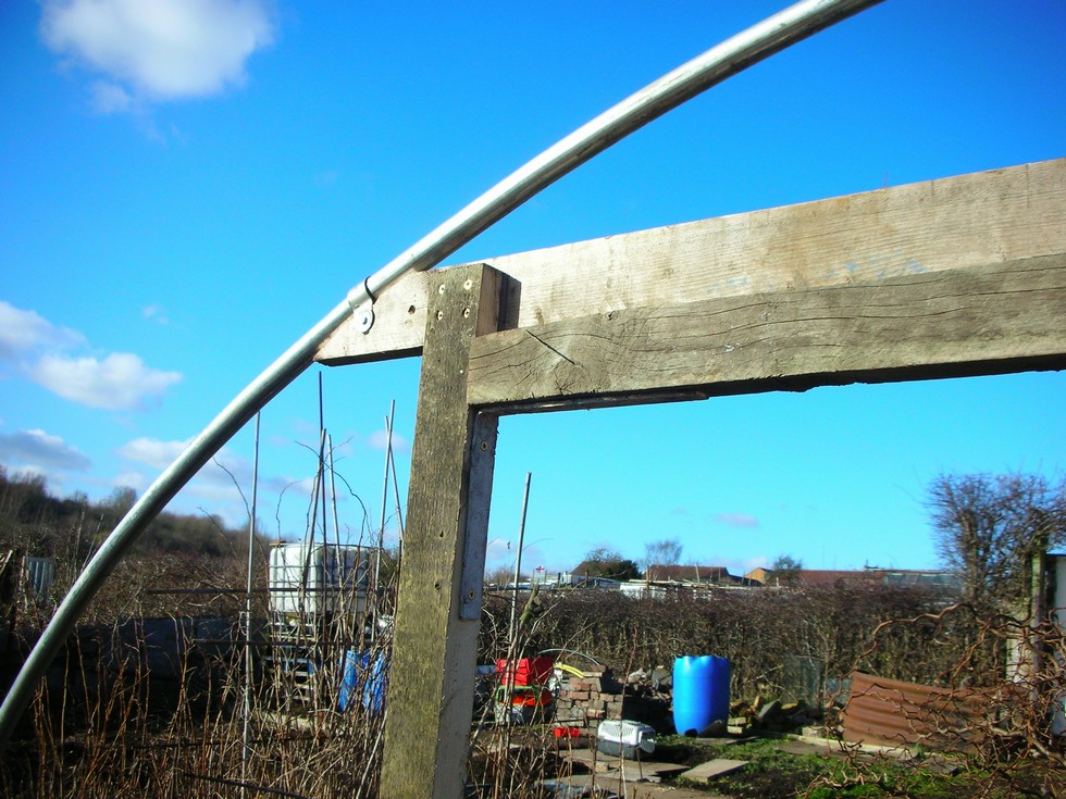 Level and attach to hoop with hoop clips. I used 7.5' lengths of pressure treated timber for the frame with around 1' in the ground. Door frame is 6' wide and 6' high