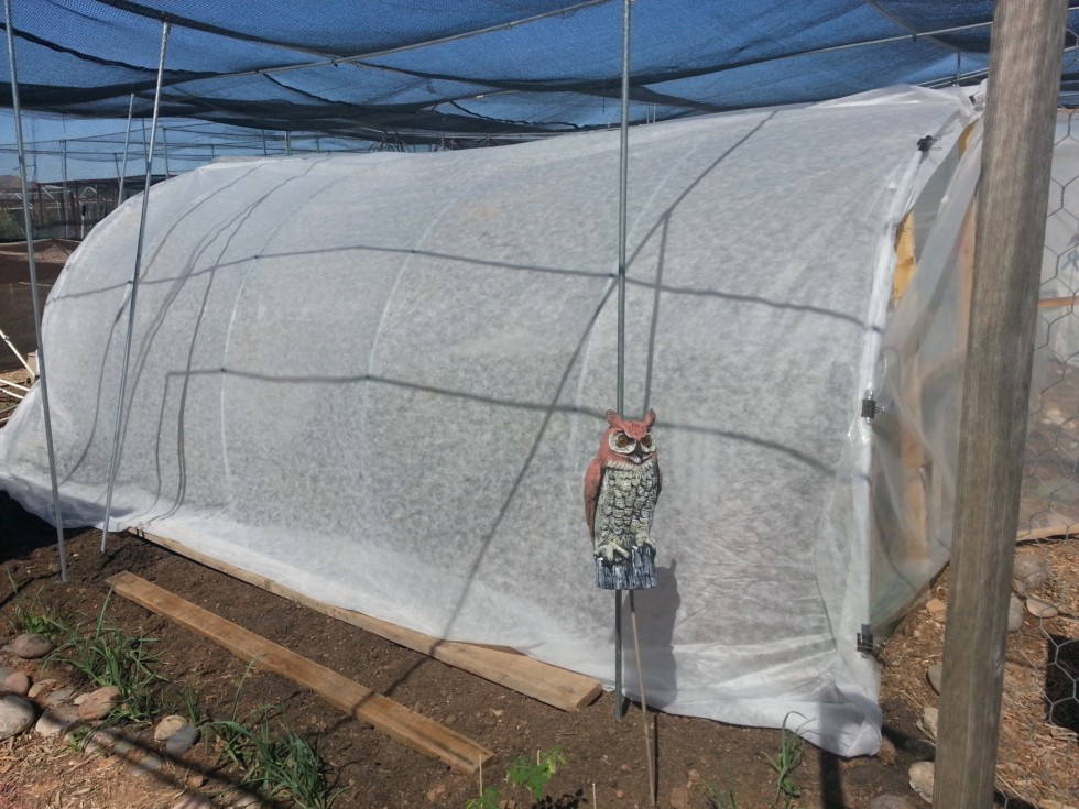 This morning I rolled the south half of Tunnel 1's film and overlapped it on the north side and clipped it in place. I then used some 1/2 oz Remay that Dean loaned me to cover the now-open south side of the tunnel. This will give me a bit of permanent ventilation, and some nice diffused light/shade. I have been growing under 30% shade and Dean has been under about twice as much shade cloth. His leaves look less weathered, and he is still getting good bloom production, so with the 80's we are starting, I thought I'd up the shade percentage. I left the spare at the base to allow secondaries to grow outside of the original tunnel frame.