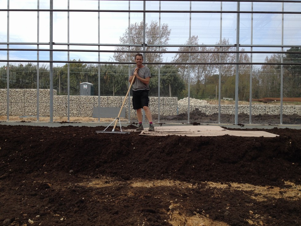 Finally things are happening in the patch and half of the soil is in. You can see our new way of walking around the patch on 4mm 6x4 sheets of plywood.
