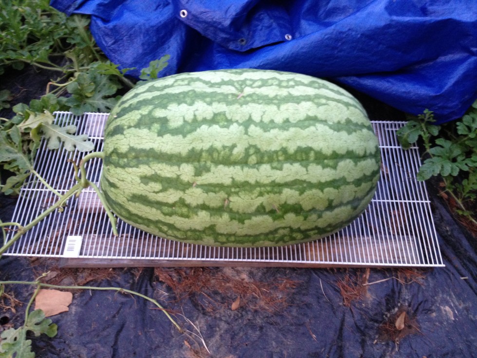 316 Edwards melon. Andrew says this is his melon! It's turning into a Beast just like him. It was chugging along nicely at 3-3.7 lbs a day but something has changed. It might be the cucumber plants I took up that were 15 feet away from the stump. I don't know but this thing has shifted gears the last two days and we only hope it continues. 10.1 lbs growth by OTT chart last 2 days! Day 40. 176.25 OTT. 40.3 lbs last 10 days by chart! Fingers crossed it keeps going!