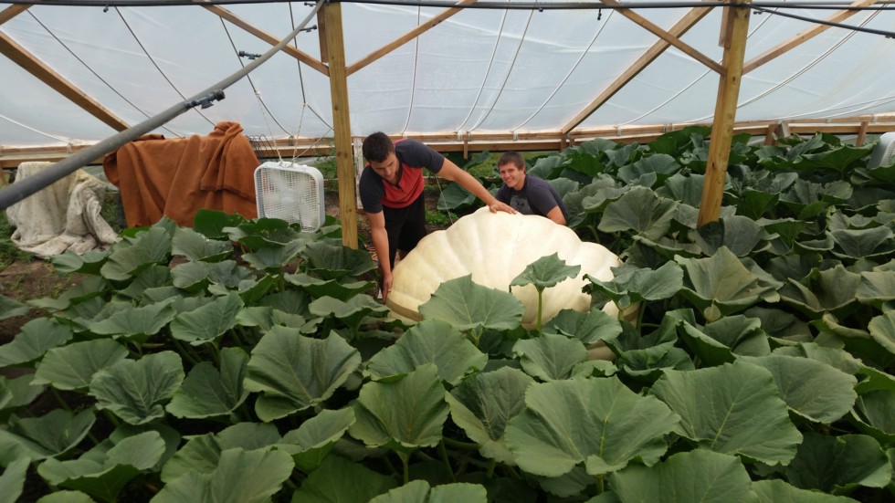 Getting the strap around the pumpkin, we have a winch on the outside of the greenhouse to pull the pumpkin.
