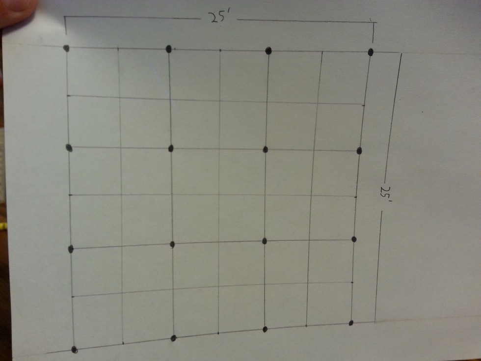 Draft for the sunshade support system, dots are T-post and the lines are support rope.