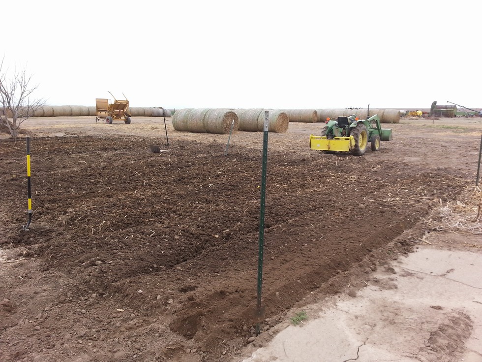 The patch is measured and marked at this point, 20 pounds of elemental sulfur and 2 pounds of urea have been added to each plant space (25'x25'). This should decrease the pH and add a little N to help break down all the corn residue from last year. At the end of the day everything was tilled in.