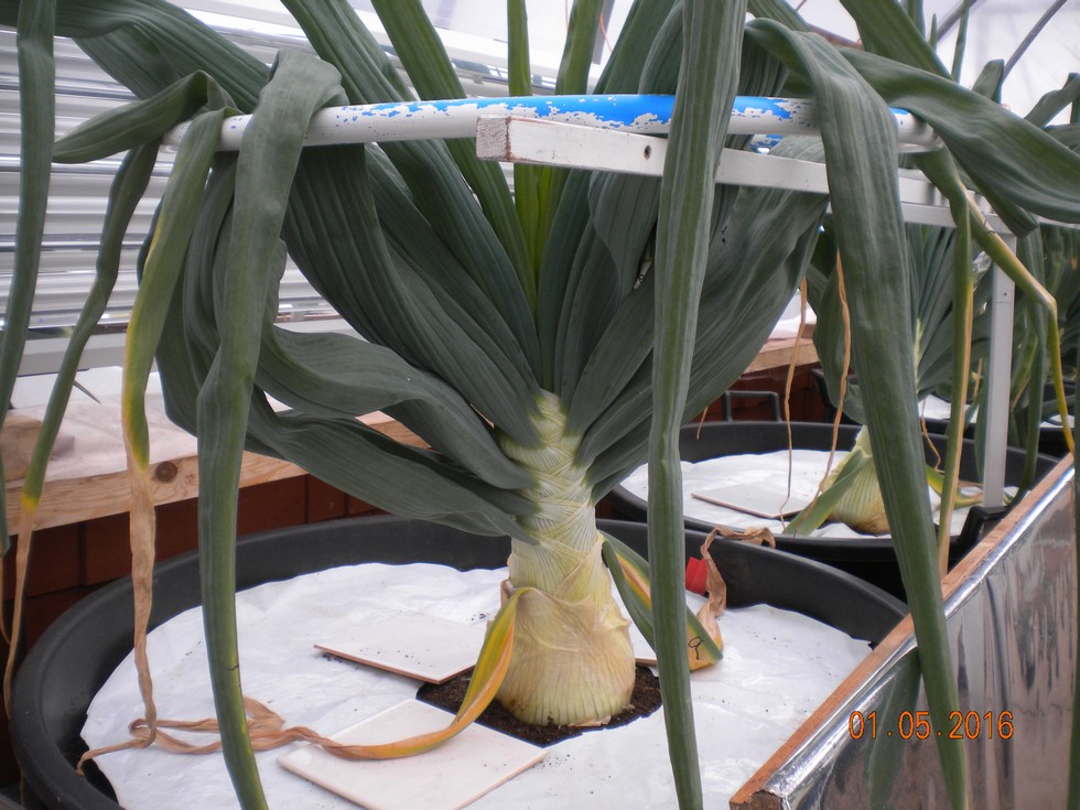 Later planted Onion in my top little tunnel is a similar size 11.2 high x 17.0 inches circ. 20 leaves.
