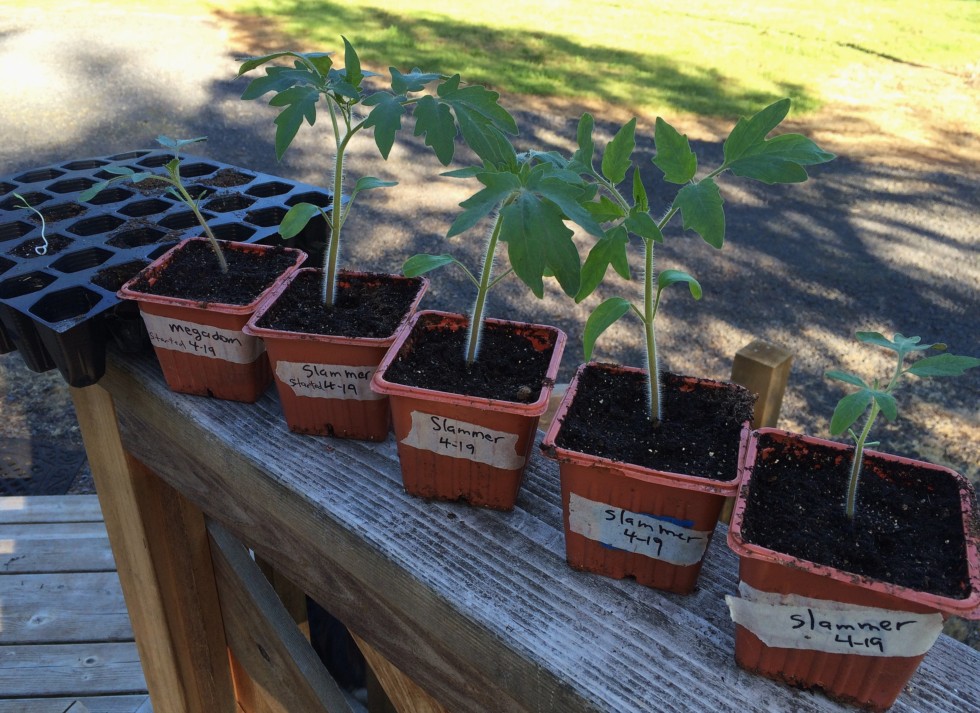 Slammer comp plants at 20 days. The Slammers jumped right out of the soil. The one on the right is a little behind because I tried to help the seed when it came out of the soil. Will never do this again. It was just a stem. Somehow made it through so need catch up. There is one Megadom that took forever to germinate. The seed stayed on for at least a week and finally fell off. The one on the far left was tray where I germinated and put it back in the barn, giving up on the last Slammer. Went out today and it said "Hey, over here!" Last but not least. Tomorrow I will transplant in the foot long pots.