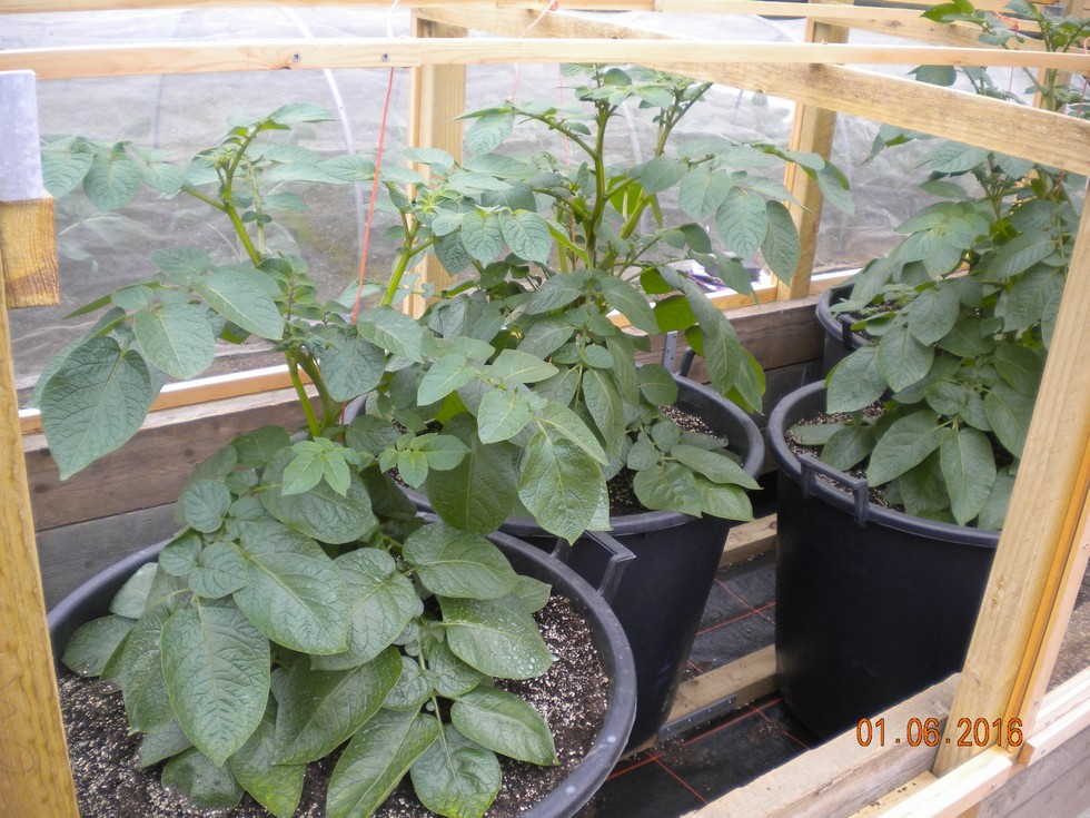 Giant Potato plants in my new frame have grow strong tops however had to remove one which had some leaf disease. so only 8 left.