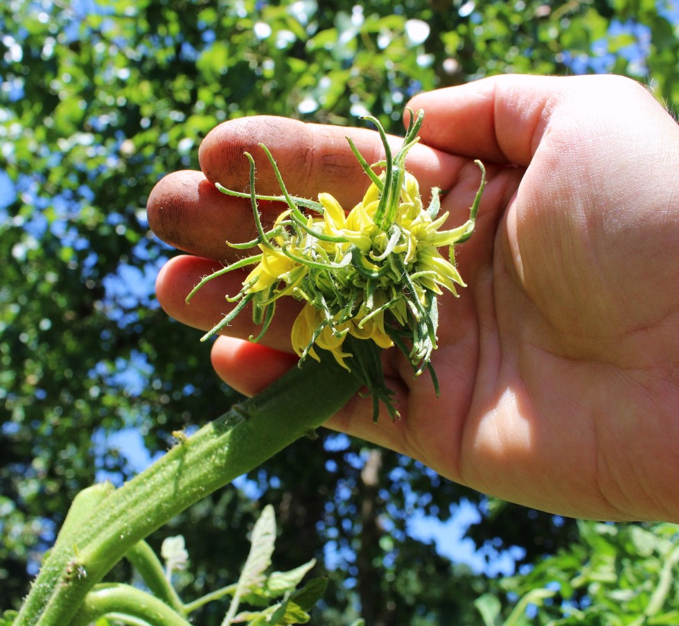 The first and last time I will name a fruit. "The Kraken" (7.05 Porkchop) opening up. I count at least 10. There are some blooms behind. It has a big, ribbon vine on top of the plant.