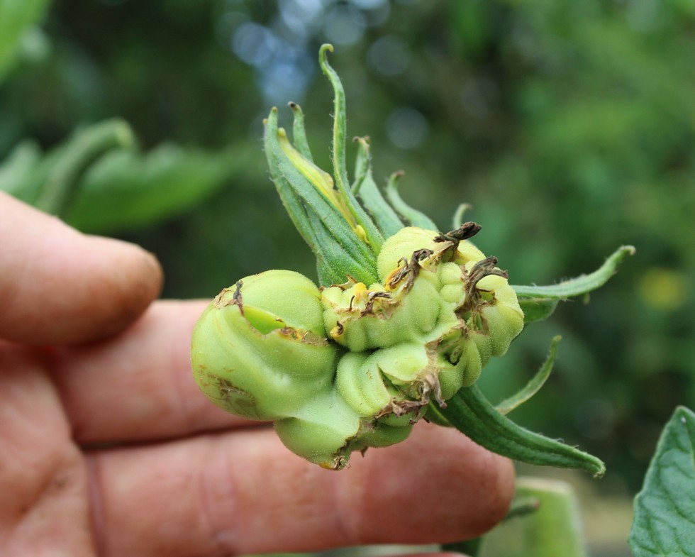 5.20 Porkchop Domingo about 6dap. What a mutant! This is happened when I walked by with my bottle on Anthesis after spraying on my pumpkin. Had a bunch left and said, "what the Hell". Different parts of the tomato start growing. I think even an unpollinated part. I wouldn't recommend it unless you want to experiment.