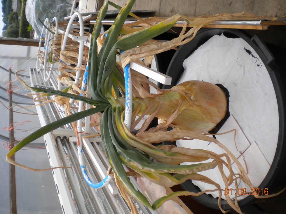 Lot2 Onion also suffered with the heat, 20.5 inches high x 28.0 circ. 13 leaves. It looks as if the chance of a personal best this year has well gone following the heatwave.