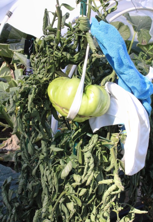 This Oxheart is super prolific with energy. I had no expectations when I included them with my comp tomatoes and is now one of the 5lb contenders. After one pollinated, all the energy went into one tomato. The plant continues to want to sprout new growth and flowers so it is a daily trim job just to focus the growth to this tomato. I will try to cross it into something this Winter as I like what a chucky fatso it is. Not sure how much time is left on. Never paid attention. Again, it will be well covered from the heat we got going on starting tomorrow.