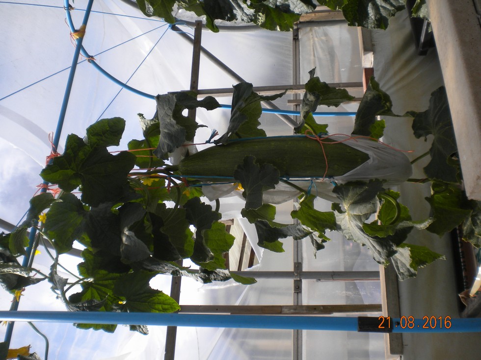 View from inside showing the plant, this has by far the best Cucumber and I have hung a sling to support it now that it is open to the wind and rain.