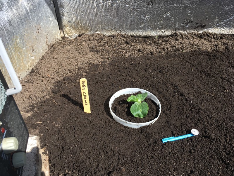 This is the south patch. I put the 1684 Est Dmg Crews in it. Soil is only 65�. As I feared, this cable may run on the cool side. It's only been a few days of warming though. I wanted all my plants a little bigger than this at transplanting but there is more snow forecast so I had to take advantage of a +5�C day.