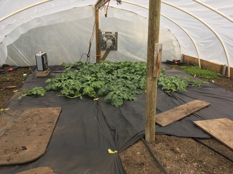 100 Crews watermelon looks better with some of the mulch down. It looks like it grew a lot since Friday. Too bad the main vine is gone.