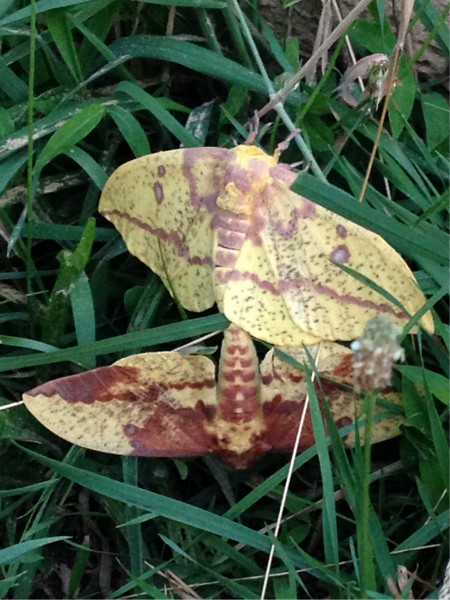 A pair of Imperial Moths mating. They only come above ground once to mate and are fairly succeptible to foraging raccoons... I'd imagine because they choose to lock up on the ground. Really cool when your bugs get super sized to fit the scale of the patch. Thankfully, their appetite isn't for cucurbits. Gnarly looking caterpillars as well, hope they made it to safety!