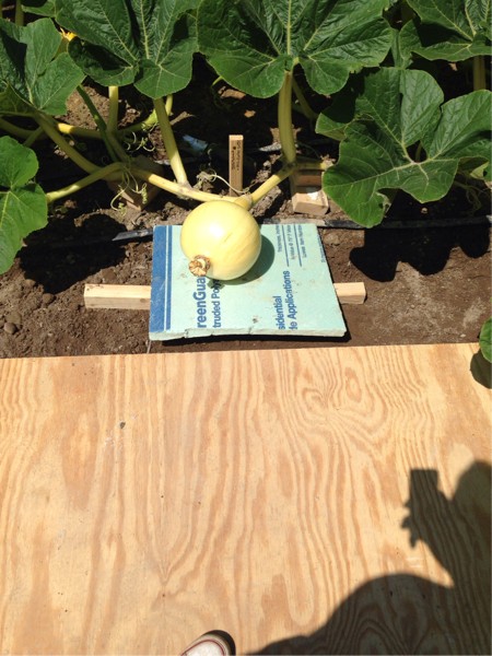 So I thought I'd share how I set my boards by myself when the wife's toenails are drying. I always dig mine level as I'm on a hill, so there's always a bit of room underneath until they get a bit bigger. The foam is a nice start, but once ready to commit, it's also a little shelf to hold your pumpkin while you have both hands on the board. Propped up by 2x4 chunks, gives you just enough room to get under, while also protecting the pumpkin from the edge of the board.