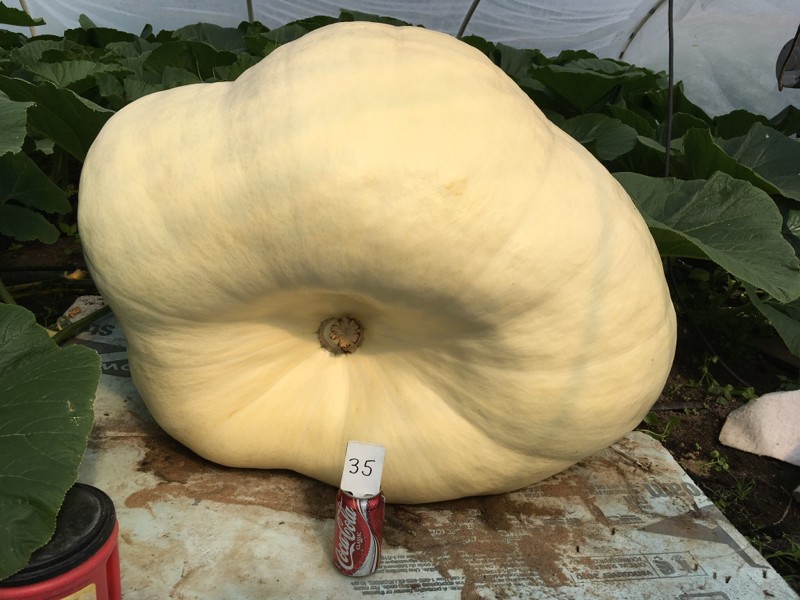 1684 Crews 35 DAP 108" cir a little smaller than I'd hoped. Poorly shaped. I pollinated one on a secondary vine just to see what the proper shape is. It's doing fine.