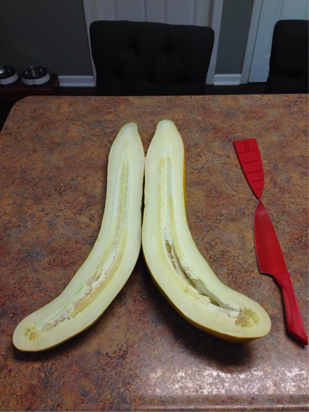 Nice uniformity inside. Looks like there should be a million seeds in there but the top half is just jelly sacs, almost like if it had more time to pollinate it would fill up better.