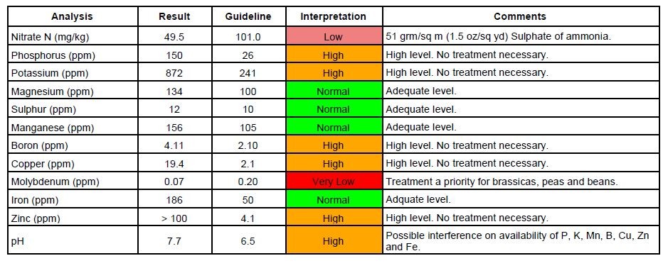 This is the soil analysis for a neighbouring plot on the allotment which we've taken on for next year. We'll build a polytunnel on it and it's next to the tap too which will help. The previous gardener let us have it because he said the soil was no good and wanted to move elsewhere. So I was pleasantly surprised to see these results, as you can see the only thing required is a bit of N which is easily done. The pH needs to be lowered too which I've managed to do on our current plot with elemental sulphur so that shouldn't be a problem either. I'll start work on it soon to make it ready for winter.