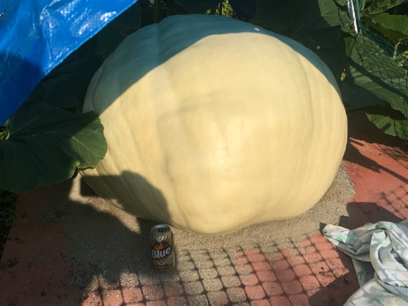 The 1821 Checkon is the biggest plant in the patch and has been given the most TLC and the growth rate is showing it. It is not going to win any beauty contests. With the slope of the patch it has enabled the pumpkin to tilt more than j would have liked and the blossom end is all but grown under. It will be a big blob design. I am not sure how it affects the overall size but it certainly is unable to stretch out.