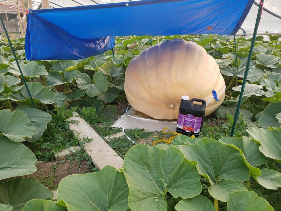 Tim the 1367 New X Self - Day 60. The plant is still looking great, the pumpkins that I failed to cull are rocketing in size. The PM is still around, just trying to control it with the Eagle 20. The cantaloupe look is getting �worse�, and the peach orange color is getting nicer...