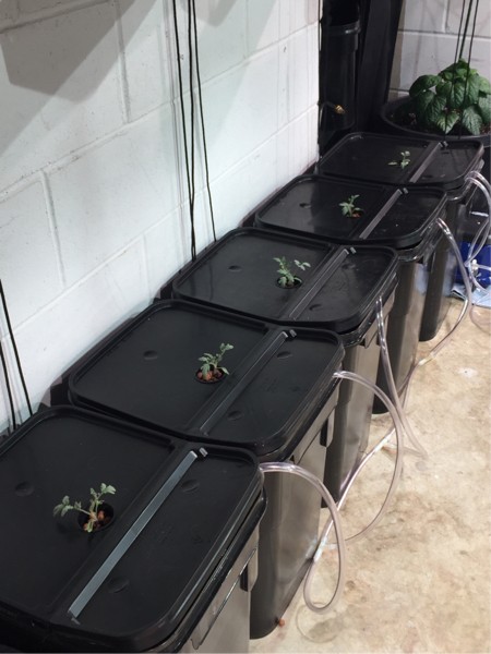 Backup late winter starts are all in there own bucket. Looks like they are about 3 days behind the chilled bucket late starts. This makes them about a week behind planned schedule. 45-7=38 days of tomato growth after pollination. Still a possibility to be competitive. I put them in a 1-1-1.5 solution at 3.0 EC. In about 2 inches I am going to try a nutrient blast on two plants. After that will probably be down to three backups.