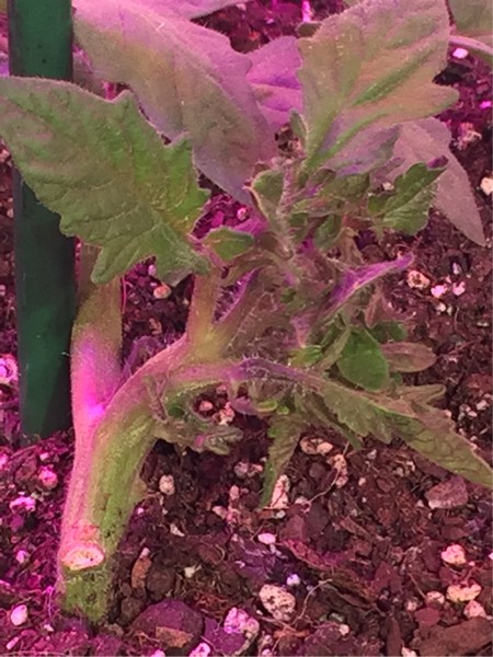 This is the clone from my lost 4.38 super mega plant. It has been the slowest clone I have ever had to get established. I would have pulled the plant but I want seeds. This plant is still showing it's unique characteristics. The new clone growth came out in a ribbon. Looks like 4 or 5 joined. I am not sure how this will straighten out to get a tomato set. Will be feeding this plant very little. Just need a 1/4 pound tomato with seeds.
