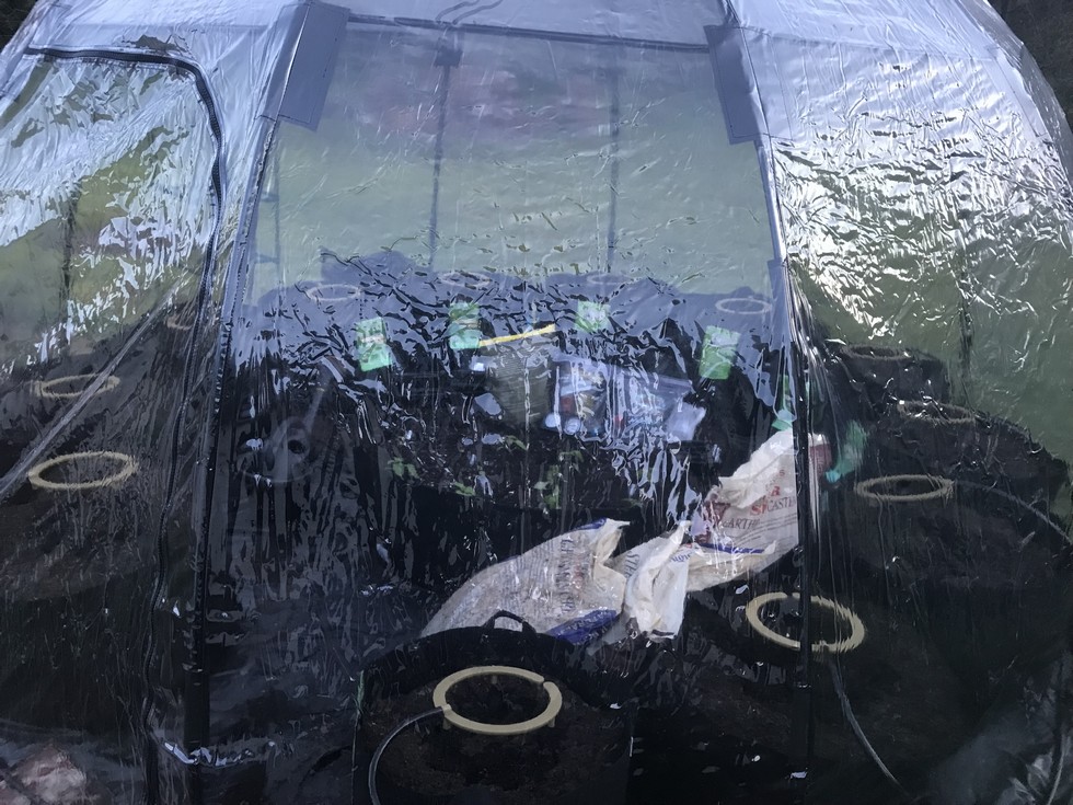 got most of my irrigation figured out for the tomatoes. still need to tweek some things. got some peppers in the middle there. need to ventilate better, 70 degrees outside 115 inside. I put a big floor fan pointing up for now to help.