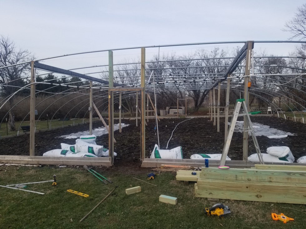 Patch is still muddy, so doing some perimeter work, extended 4x4s all the way to the top, will be putting 1 or 2, 20' 2x4 across the 3 supports. Then they will get the wiggle wire treatment. Hoping weather stays nice next couple days to get planting areas ready