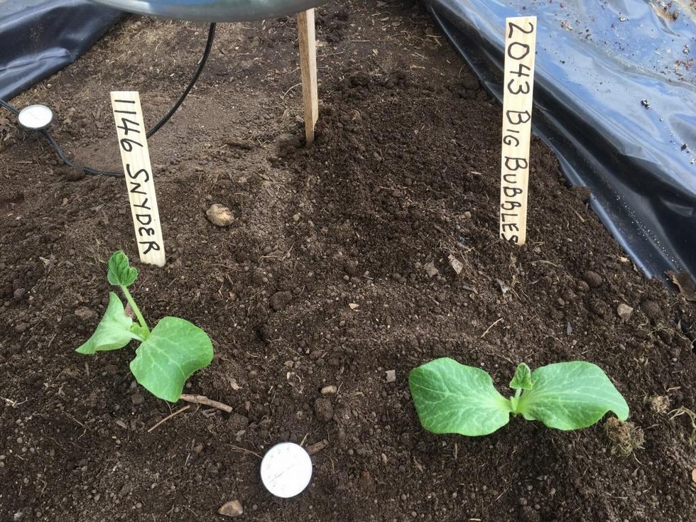 Planted the 2043 Big Bubbles with back up 1146 Snyder today. Soil temp 73 deg under black plastic and heating lamp overnight in the cold frame. Planted 8 days later than last year. Buried 3� of stem. Threw in Myco and watered with dilute Miracle Grow (all you thoroughbred growers relax � I didn�t have any Jack�s and couldn�t stand to use just water �promise, no more M.G.). Pit already has kelp meal, 10-10-10, 2-week-old Myco and 1� cover of sterile dry mushroom soil. We�re Off !! Will hold off planting the other 2 seedlings for a week in case of environmental catastrophe over the next few days.