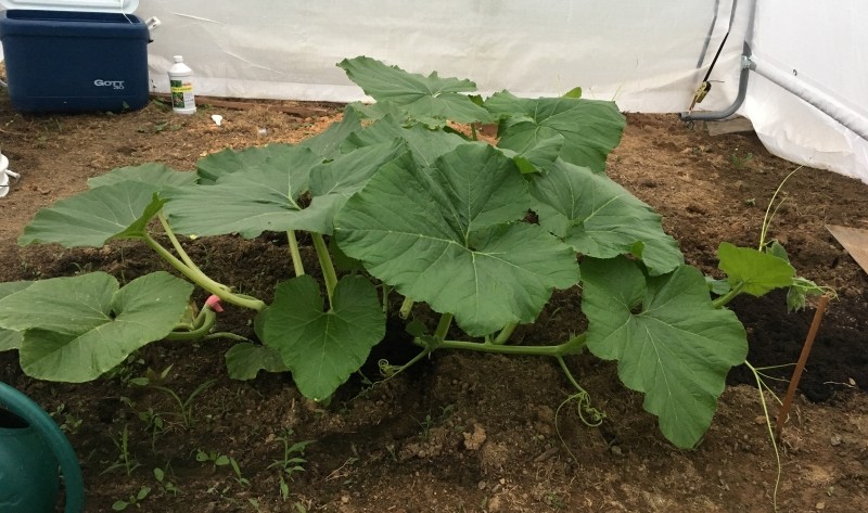 A few things have been done in the patch so I figured an update was called for. I have changed the direction of both vines. A ditch has been cut ahead of the advancing main vine of the 2043 Clementz 6" deep x 8" wide and filled it back in with rich compost. This will aid in rooting as the plant advances. You can see in the first 5-18-18 photo posted the placement of the loosely wrapped pink plumbers tape on the stem split. There was a little sulfur powder applied as well. About a foot down vine from the tape you will see soil covering (time for some more roots). This plant is way outside of the original irrigation ditch and is advancing 6-8" a day. The two sticks stuck into the ground far bottom right of last photo show 24hrs of growth. It will be out of the greenhouse by Tuesday at this rate. I will think on what to do with the Holland 1790 plant. I would like to have it as my pollinator but some noobie planted them on top each other.