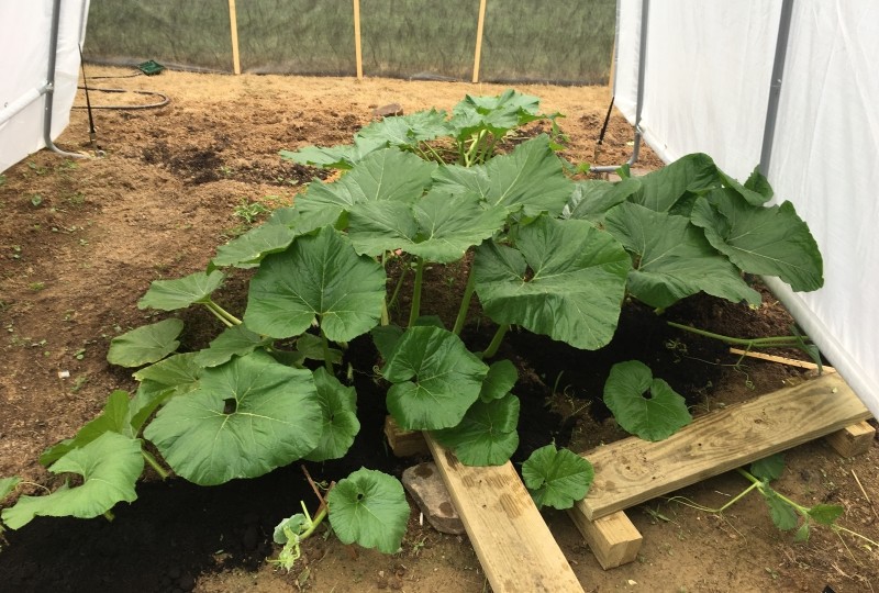 Back in town and what do I see? A pumpkin plant much bigger than me. I was pleased to see her trucking along in my absence with my watering timer doing its job.