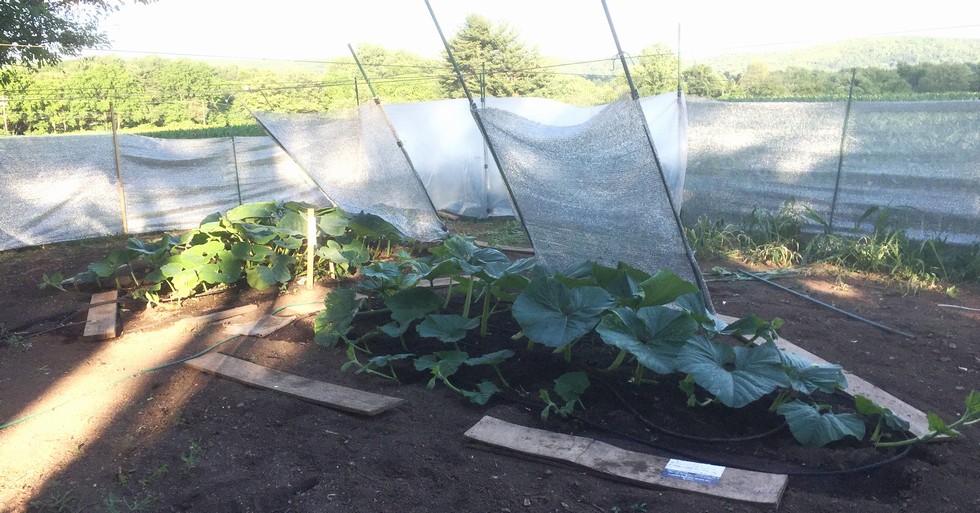 Big Job today � went from the small windbreak enclosure to the Full Monte. 50% occlusive woven aluminum. Poles anchored in all directions � gonna take a hurricane to take that sucker done. Enclosure 30% bigger than last year, and only 2 plants this year compared to3 last. I've become an adult. Sprayed:1/2 strength Heritage, Full strength Cleary 3336 systemic fungicide; � strength Captain Jack DeadBug for vine borer; � strength Eight to get the cucumber beetles I saw today, � strength Star-Phite (0-0-26 phosphite). Irrigation system enlarged by 2 more rows to accommodate the secondaries that are growing like crazy! Nice young female 13� out on the 2043 main stem. Plenty of males on the 1501 to do the work.