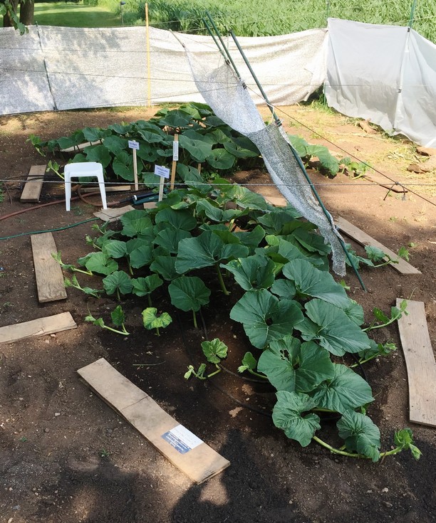 both vines in good shape � the 2043 coming toward camera has a great female flower at 13 ft on main stem with 15 secondaries behind it � started the S curve, expecting to pollinate with the 1501. Looking to set up the 1501 for quantity, as almost all secondaries have female flowers and a historically orange lineage � maybe get 4-5 orange 250�s for my wife to put outside her children�s swim school � KIDS JUST LOVE PUMPKINS. The 2043 will provide my first 1000 pounder.