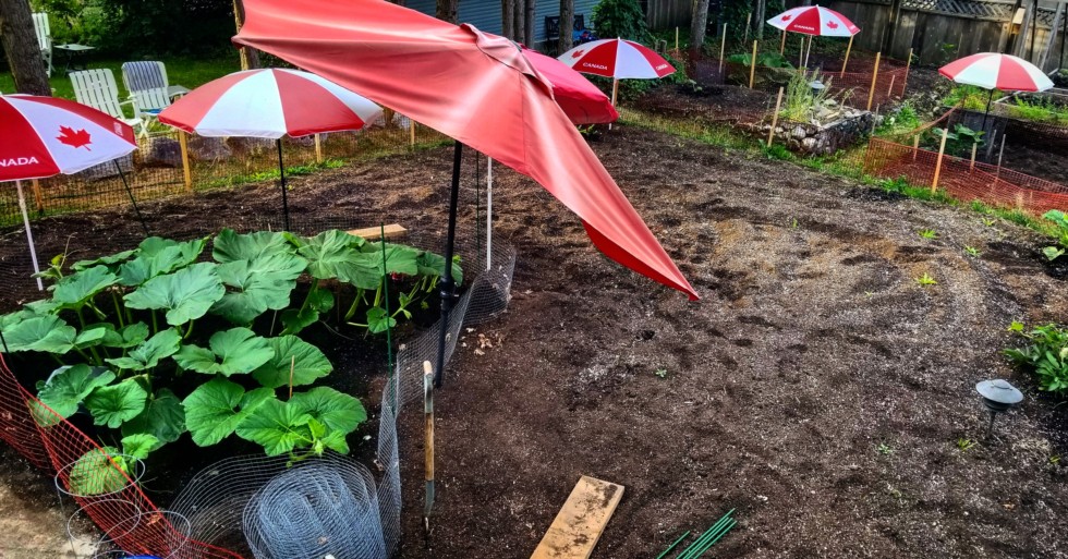 Oh the humble beginnings in the garden! Hmmmm, think I'm a proud Canadian or something?!? Here's a look at Ella as well as where Laverne, giant marrow and Frank will be growing. I'll take the same pic in September and it will be a sea of vegetation (and hopefully some monster fruit!). Notice the double fencing... #nosquirrels Also, plenty of shade structures to prevent from sun scald in this heat wave.