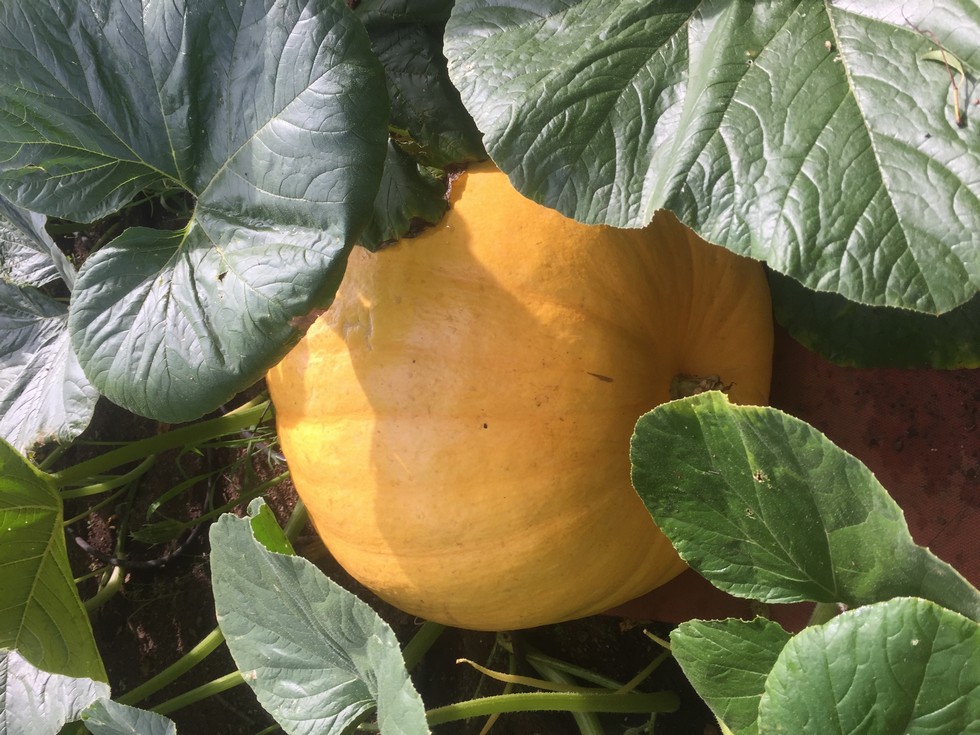 26 DAP on the 1501 � OTT wt est 110 lbs � never had one this big this early. Definitely orange! 2 other nice ones a week or so behind. Vine looking good, all secondaries have reached limits of fence and so cutting them off at growing tips. The 2043 is FINALLY producing female flowers � pollinated 3 over last week with �self� and one with the 1501. Somewhat concerned with the vine � Main growing end turned yellow and leaves wilting � afraid of �Yellow Vine� � saw several of the carrier beetles today on vine as well � Cut off main vine back about 3 ft. Huge secondaries growing about 10-12�/day. Sprayed with Eight, Earthworks Potent Sea and Earthworks Protein plus. Plan to Spray with Merit tomorrow and fungicide. Cal-Vantage waiting in the wings. Still adding a tablespoon mixture of Mycorhizae, Kelp meal, 10-10-10, gypsum, dry Jacks 20-20-20 and scoop of dry sterile mushroom soil at each buried node.