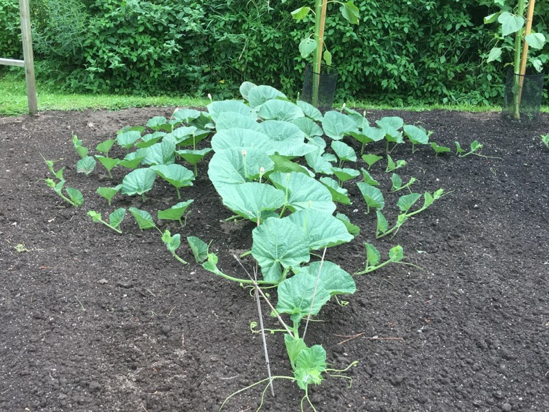 265 Engel bushel gourd is a bit more aggressive then the Kent and is 9 feet wide at the stump and 12 feet long. We pollinated a practice female on this plant tonight as well but just on 1st secondary about 3 feet from the stump.