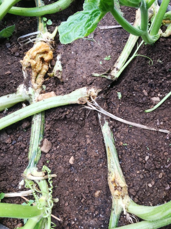 Starting to see this stuff here and there � presume vine borer despite Captain Jack�s Deadbug that totes killing vine borer right on the front of the bottle. Made solution of Captain Jack�s, Eight and Cleary�s 3336 and poured it on all of these lesions I could find, including main stem of 2043 yesterday. Today, an under-leaf application of CalVantage and Jack�s 20-20-20. Temp later got to 100 deg in the shade! Local River 4 feet above banks. . Small tornado touched down a mile from the patch during Friday night storms (2-4" rain), Crazy.