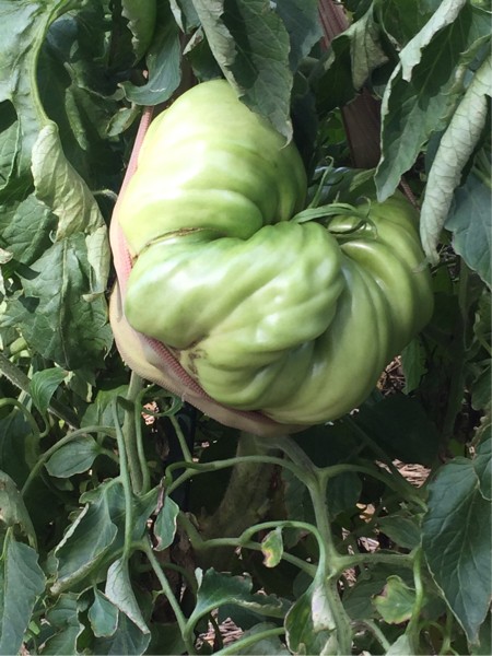 Since there has been discussion of crosses on the tomato board, I thought I would show the parents of my planned cross. This tomato is currently weighing about 4 1/2 pounds. It is from the 6.13 Zappa Brutus Magnum. Notice the unique shape of the fruit. This is consistent on all 3 of the Brutus Magnums I have. Foliage has thinner leaves and almost a willowy appearance. It will be crossed with...see next post...
