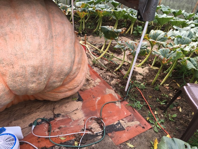 Day 85 today. Trucking along in some coldarse, wet, overcast weather. Overall health of Pumpkin is nice. She is still throwing small superficial growth cracks. They are being managed daily. I did loose a secondary vine to rot. 40+ healthy leaves gone. The real bummer was the location. That vine entered the main at 9in away from the pumpkin stem. No playing around with rot that close to pumpkin...the vine had to go. A nasty rain storm rolled through Friday night dumping over 2" of rain in less than an hour. The erosion of my sand base was extensive. I repaired that nonsense and got her high and dry again. Here is a picture of the damage. Where is the sand?.. Down lower in the patch! Good grief.