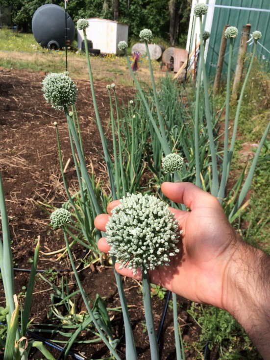 Giant onion seed heads. I left the largest Alisa Craig giant onions in the ground last year to make seeds this year.