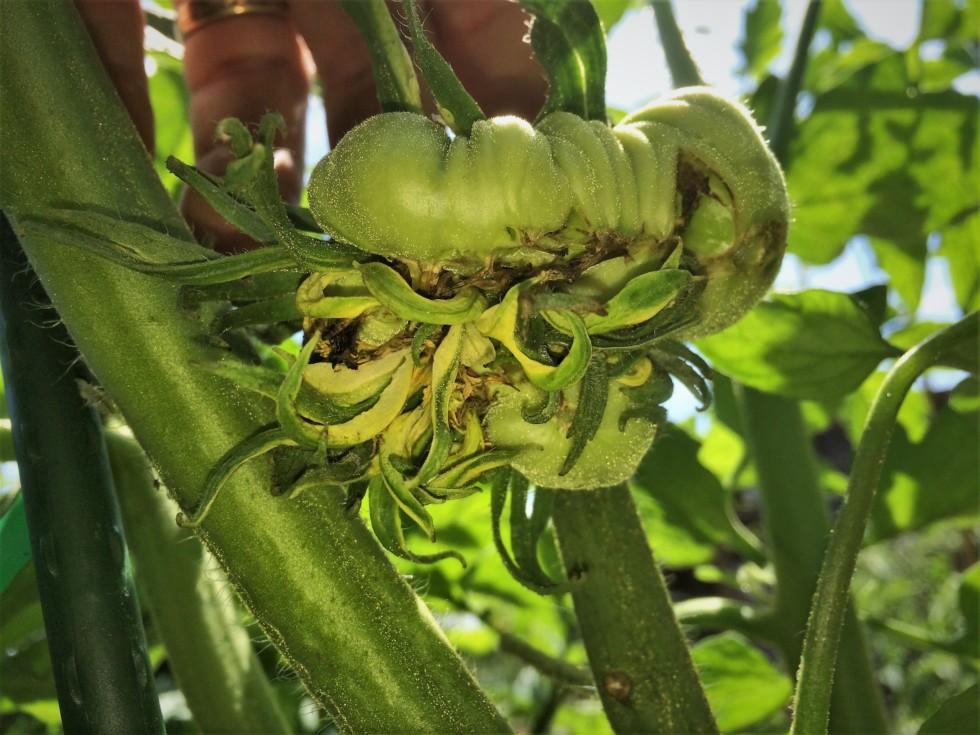 It was nice site to see the 5.95 Konieczny had pollinated! At 9 days since pollination. A few in the megabloom didn't take but I think I'll fly with this one! One part is pushed up against the main stem and I'm still not sure what I'll do. I don't want to cut the main or mutilate the plant too much. I may coax the tomato to the left side slowly. Don't want to snap it off!