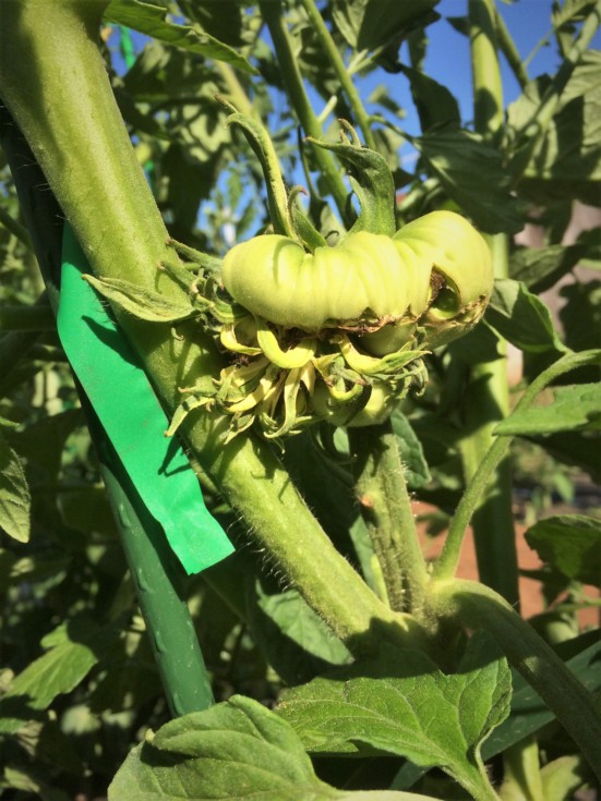 I agonized about what to about the main stem being in the way. In the past I would cut the main below the tomato, but that usually makes the tomato stop growing in my experience.