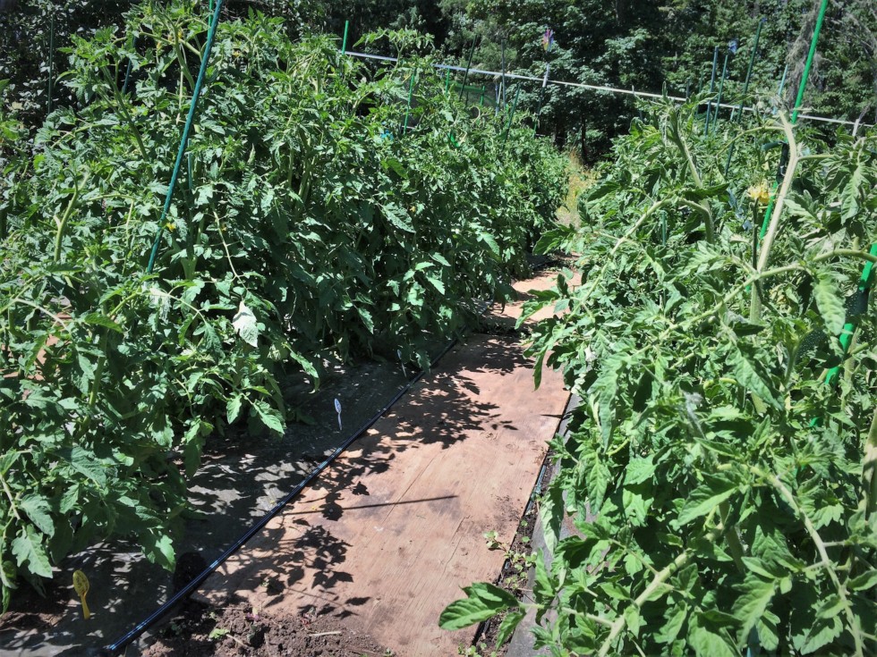 The tomato plants are about tall as me now. This is the first year I haven't had curled leaves. Plants have been the best they have ever been. It's got to be the WOW mustard I tilled in this spring. Also, the 3 WOW starter paks under each plant. The plants are growing loads of flowers also, but that isn't translating in many large megablooms. Just many many singles and doubles across the board. There are some triples though. I guess I'm getting greedy and impatient.