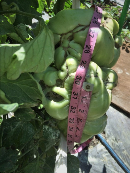 Here we go! Reached 30.00" at 42 dap. Still green. Would like to get 7,8,9 days more? Is that too greedy? That old blossom end rot has been cleaned out and is dry. Kind of reminds me of Wixoms last year. I could put a golf ball in there. Basically, a small tomato rotted away, I removed the old stuff with a spoon, and it dry. The walls of the neighboring tomatoes can be seen all around so it won't get any deeper. No leaking, dripping, or active rotting.