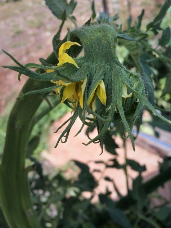 Close up of the flower. Plenty of stem to provide all the tomatoes with what they need. Just started the toothbrush program and will continue for the next week.