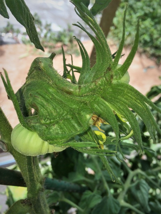 Here is the flower up close. Again, I was growing a first truss tomato down low, cut the plant practically in half. Cut through large secondary's. This tertiary grew out near the cut. I cut the original tomato last week as it developed a rot spot. This is why I don't cut secondary's (suckers) off like I used to. Let the plant grow.