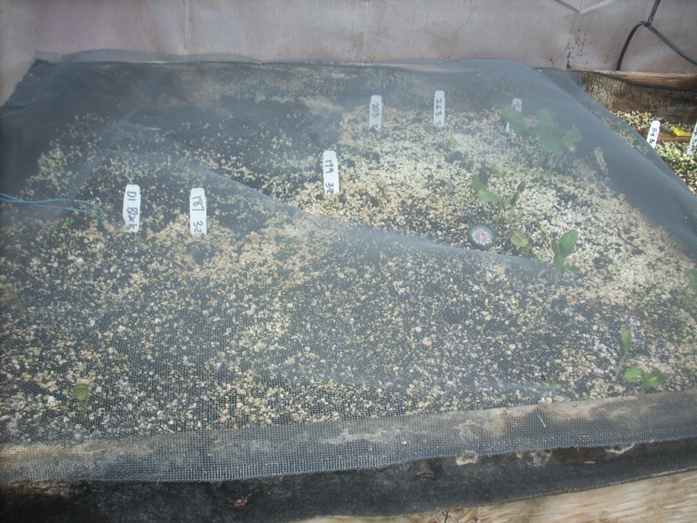 I have my melon seeds starting underneath this screen. I have had some problems with mice digging up the melon seeds and eating them, so far the screen is working. The seeds will sprout in this bed, then be grafted and put under mist to heal.